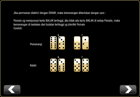 5. Jika akhir dari permainan, terdapat nilai jumlah kombinasi kartu yang seri, maka kemenangan akan di hitung dengan mengadu balak tertinggi dari setiap pemain. Jika dalam meja, tidak ada pemain yang memiliki kartu balak, maka perhitungan akan dilakukan dengan cara pemain yang memiliki bulatan tertinggi akan menjadi pemenangnya.